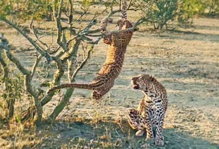 Leopard Cub Falls Out of Tree Onto Mom’s Head