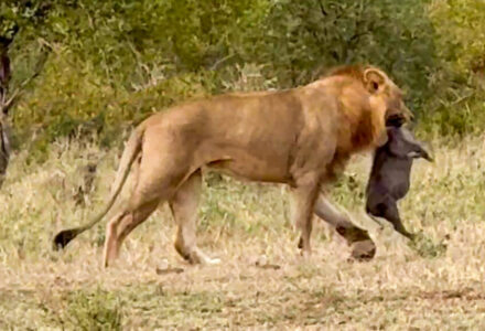 Two Male Lions and a Lioness Take Down Warthog Together