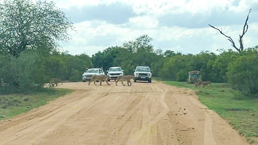 They moved in unison and with a sense of purpose. As motorists looked on, more and more lions came into view. They emerged from the thicket on one side of the road and walked purposefully in front of the cars, disappearing into the lush greenery which skirted the sandy road.