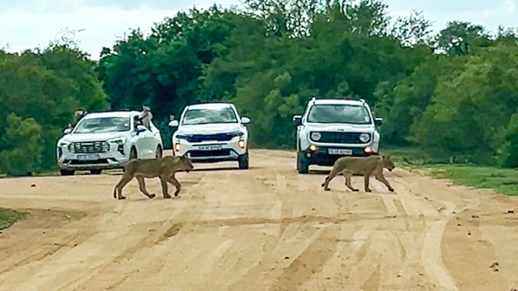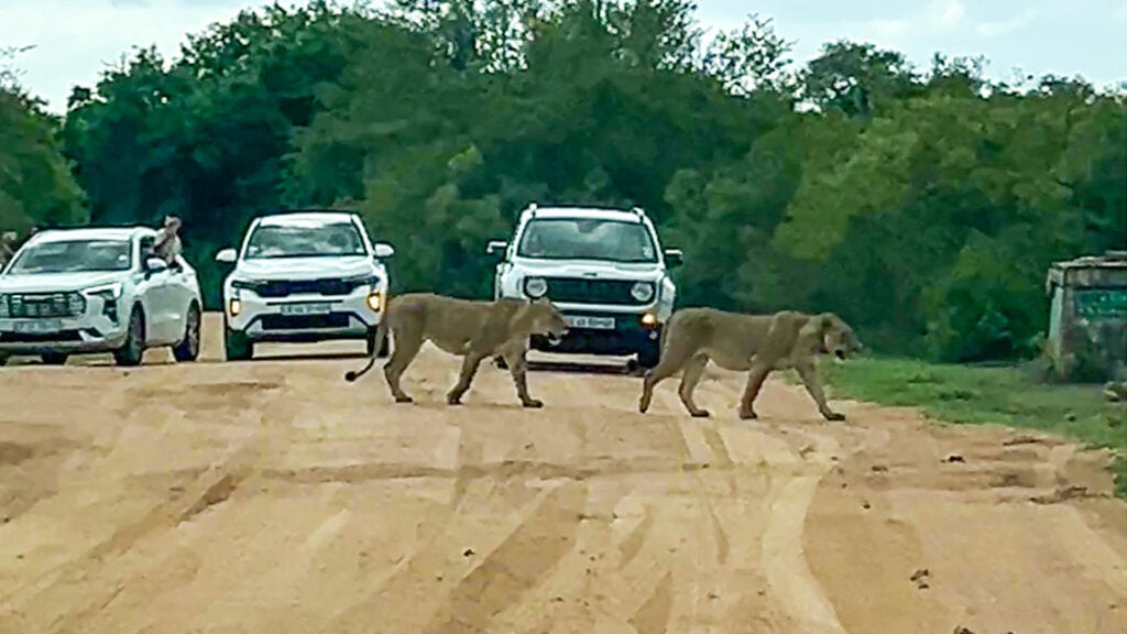 Lionesses are highly cooperative and socially bonded, and road crossings can briefly reveal this tight structure as individuals keep visual contact with one another and pause if a pride member lags behind.