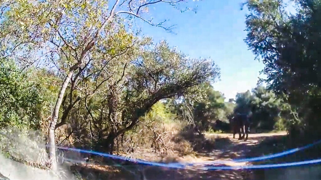 As we join the action, we get a dashcam view as he makes his way down a dirt road, fringed on either side by dense vegetation.