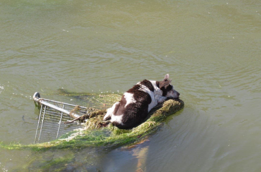 To their shock, it was a dog, perched on a soaked shopping cart with the water all around her and no owner in sight.