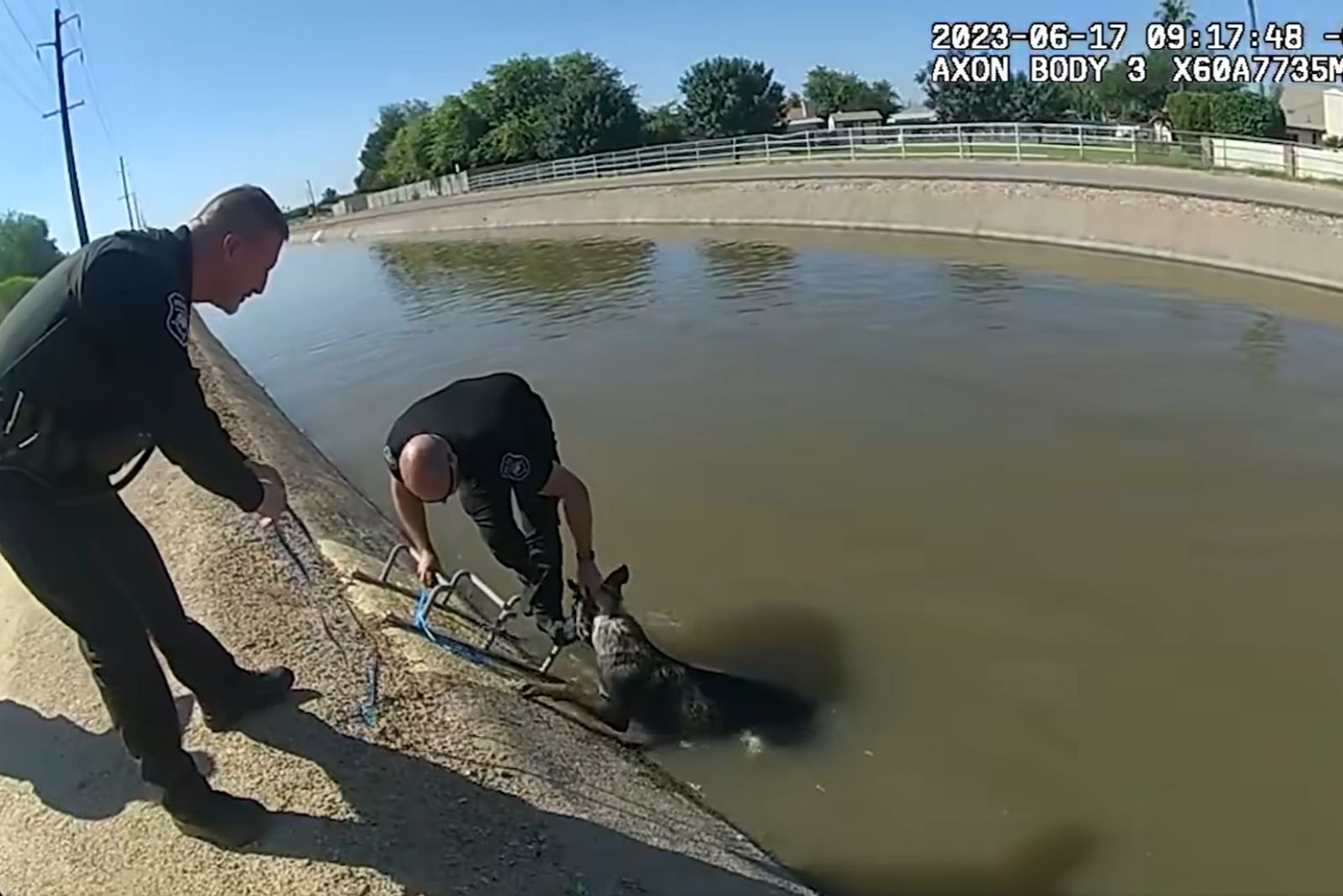 According to the department’s Facebook post, Officer Sorenson immediately jumped into action. He removed his ballistic vest and gun before entering the canal to try and help the dog.