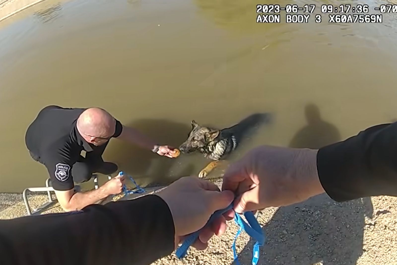 When the officers arrived, they found a German Shepherd stuck in a canal. The exhausted pup was desperately swimming back and forth with no way to escape.