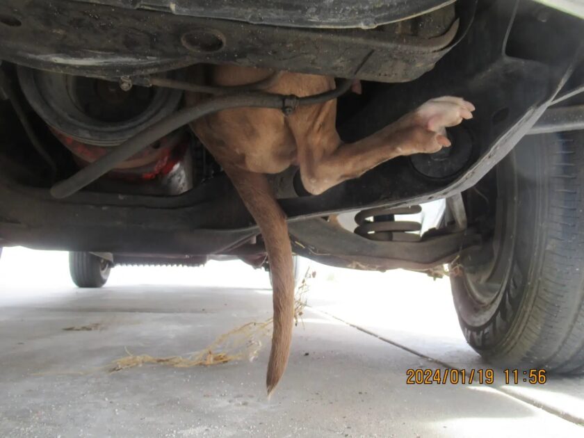 Sliding underneath the car, she was met with a startling sight. A dog’s leg dangled helplessly from the engine compartment. Somehow, a mischievous pup had squeezed herself inside the vehicle and could not escape on her own.