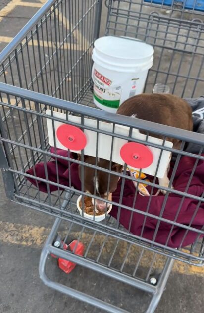 A tiny puppy sat quietly inside a shopping cart, completely alone.