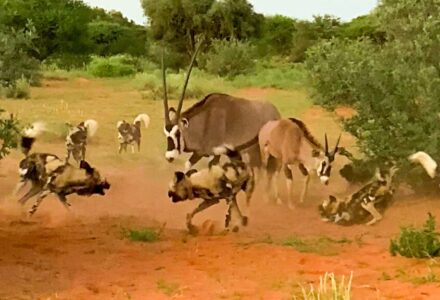 Two Oryx Fend Off a Pack of Wild Dogs