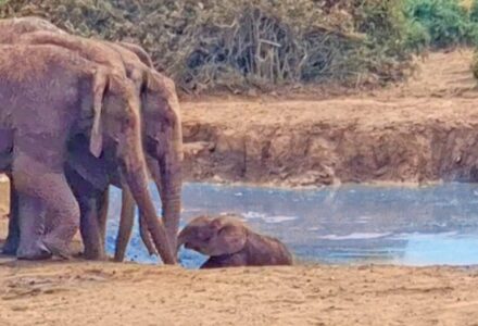 The baby elephant slipped into the muddy ravine and couldn’t get out. However, the herd soon came to the rescue! Jolandi explains she had been with her…