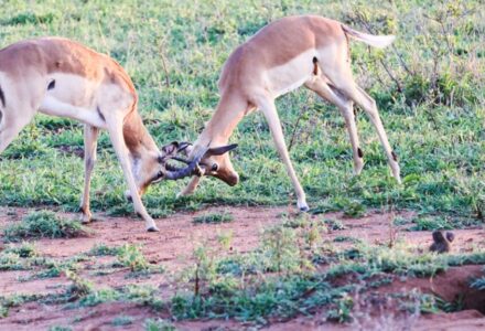 The two male impalas lowered their heads and brought their slender, lyre-shaped horns together in a light clash in view of spectators. A little away, staying close…