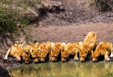 Lions Squeeze Together Just To Reach Water