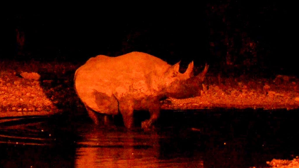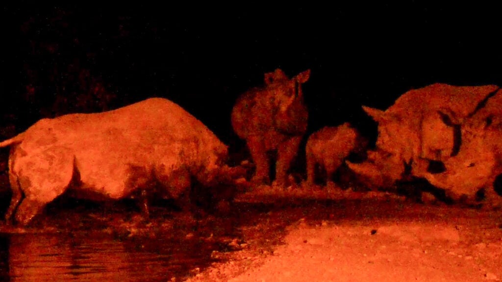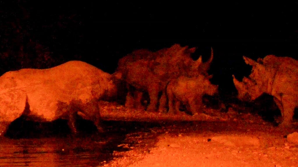 They are also more social by nature. These white rhinos arrived as a herd, looking for a drink of water in the dusky shadows of night. White rhinos often tolerate each other at water sources, forming loose groups.