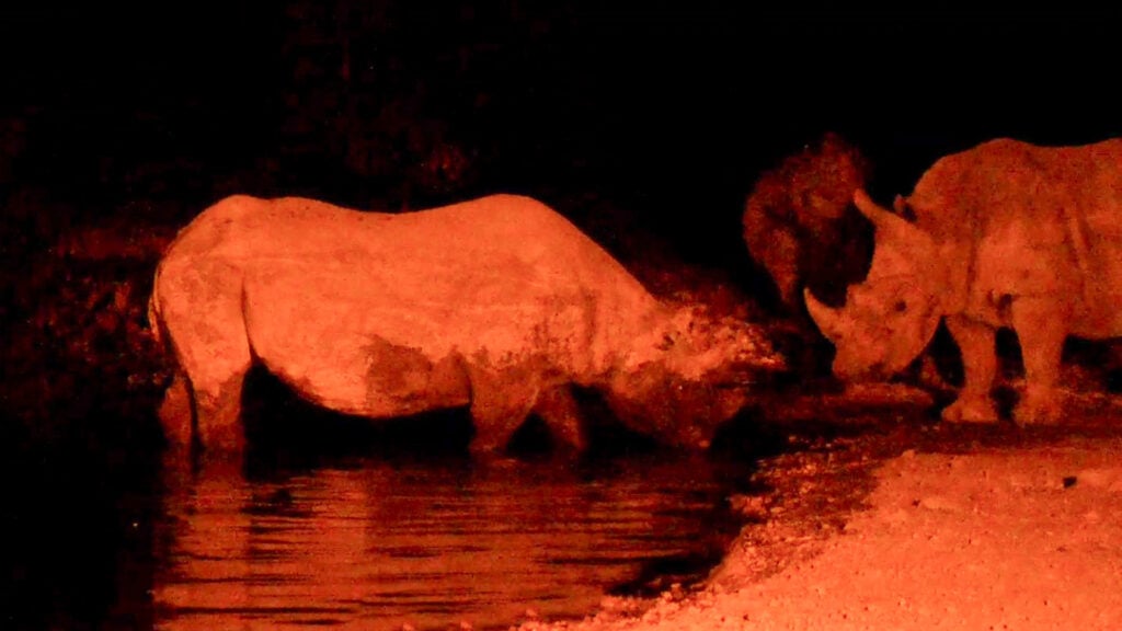 They are also more social by nature. These white rhinos arrived as a herd, looking for a drink of water in the dusky shadows of night. White rhinos often tolerate each other at water sources, forming loose groups.