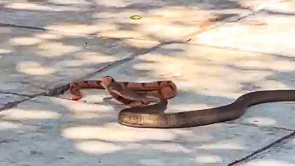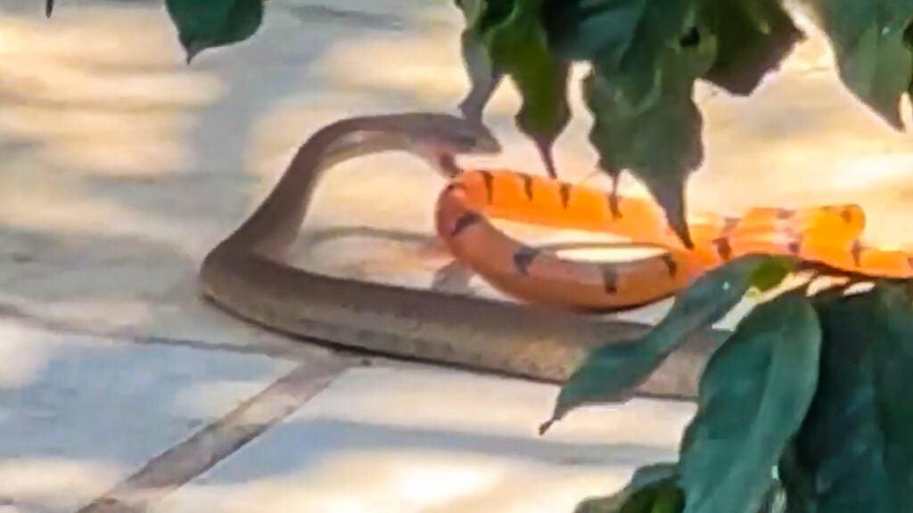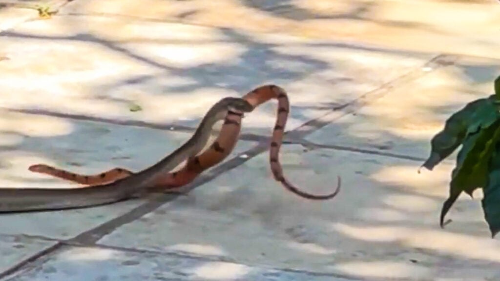 The boomslang used its larger size to its advantage, quickly surrounding the tiger snake with its long body and preventing it from easily escaping. Without any way out, the tiger coiled itself up, preparing to fight its way out in an attempt for survival.