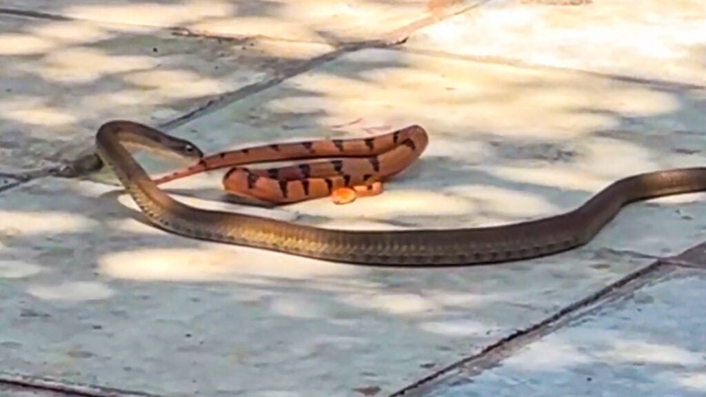 Sometimes, when the time comes, there are no options to avoid the jaws of a larger and stronger animal. A tiger snake in Hoedspruit, South Africa, discovered this the hard way when it found itself the prey of a hungry boomslang.