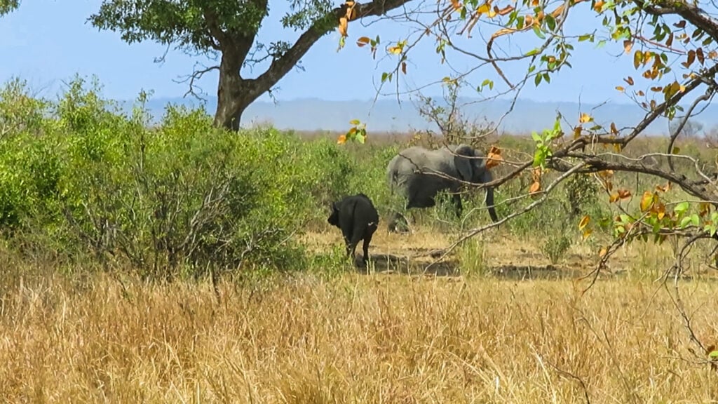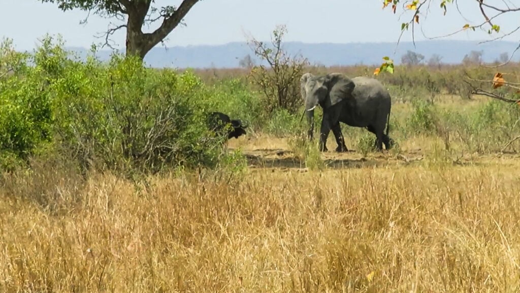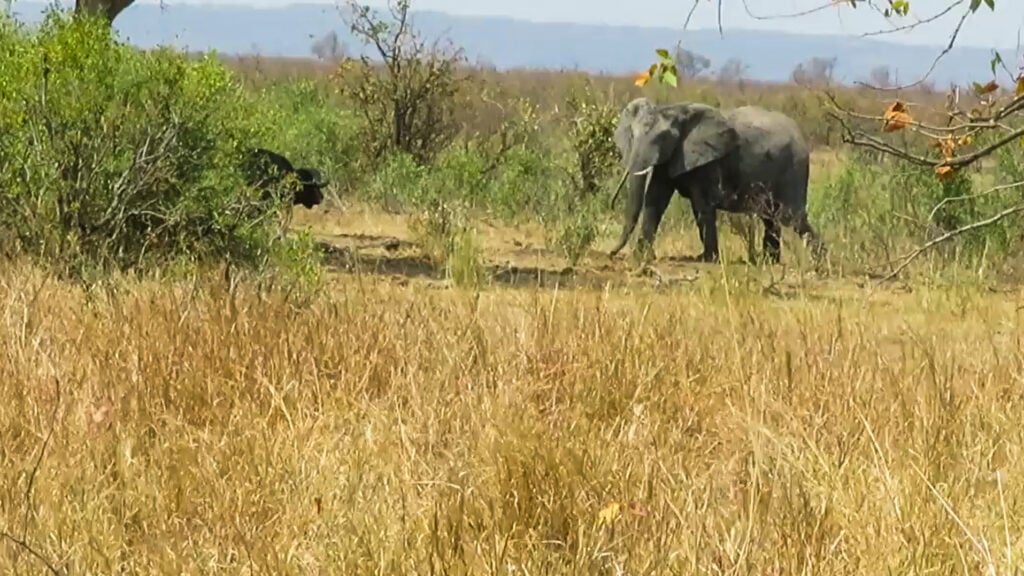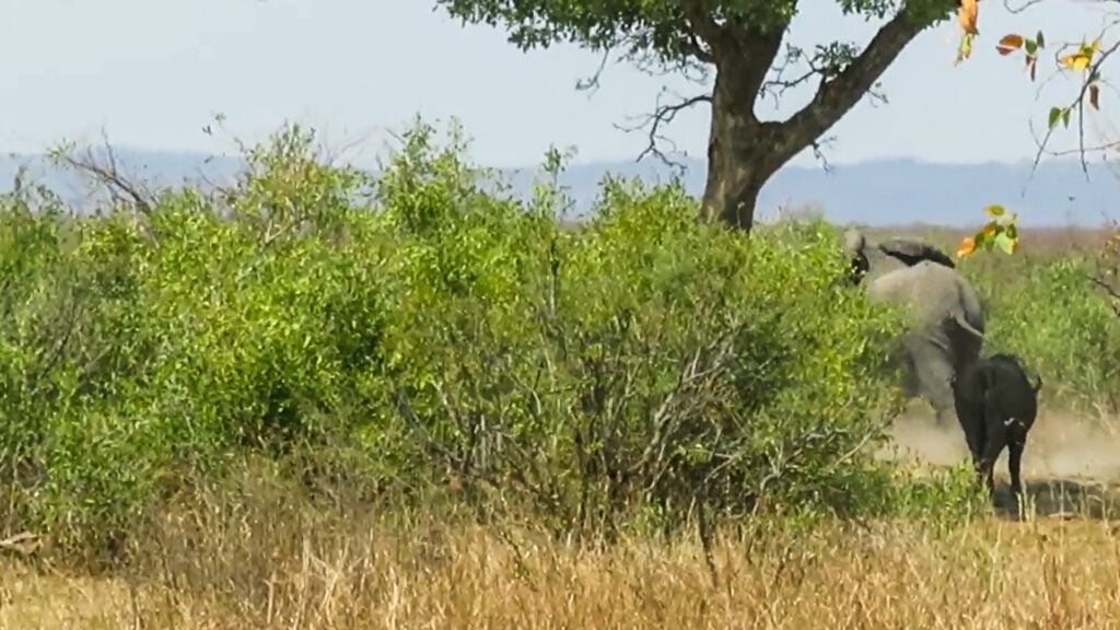 Unfortunately, this slow and imposing approach clearly wasn’t quite as threatening as the elephant hoped, and the buffalo didn’t seem at all impressed with the attempt.
