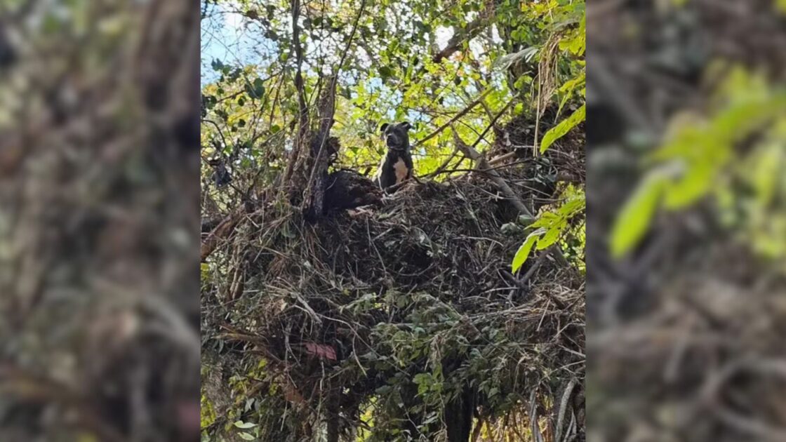 However, as the river returned to its basin, the pup was stuck on the tree with no way down!