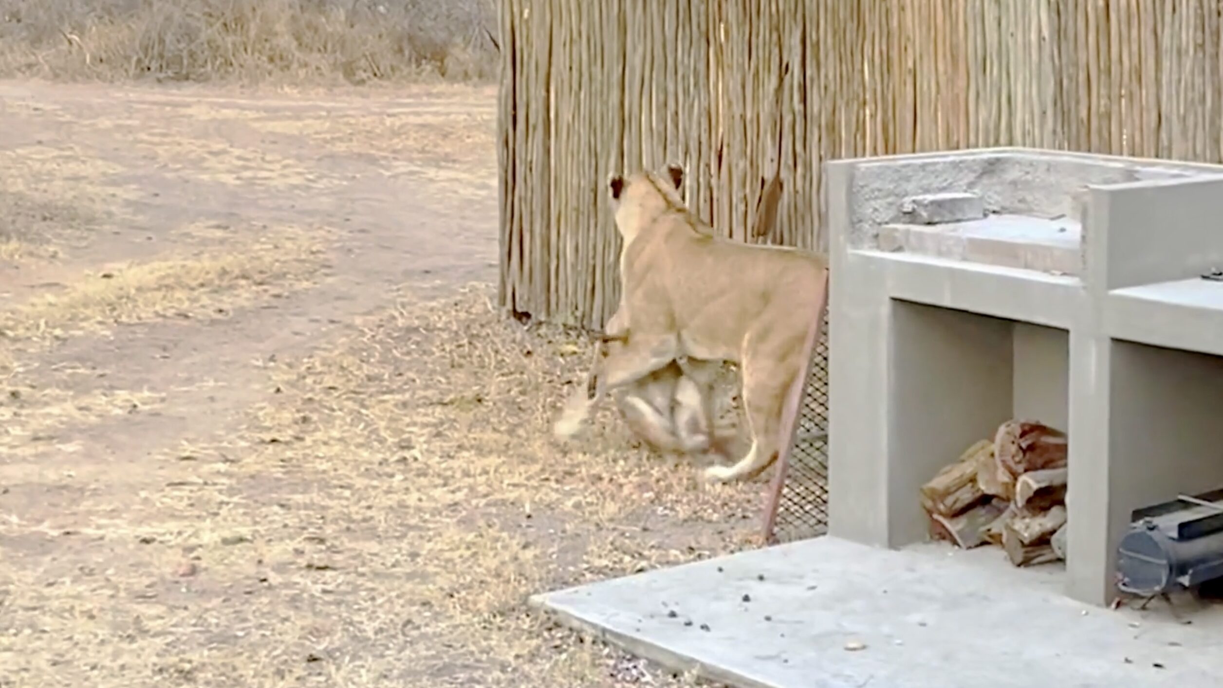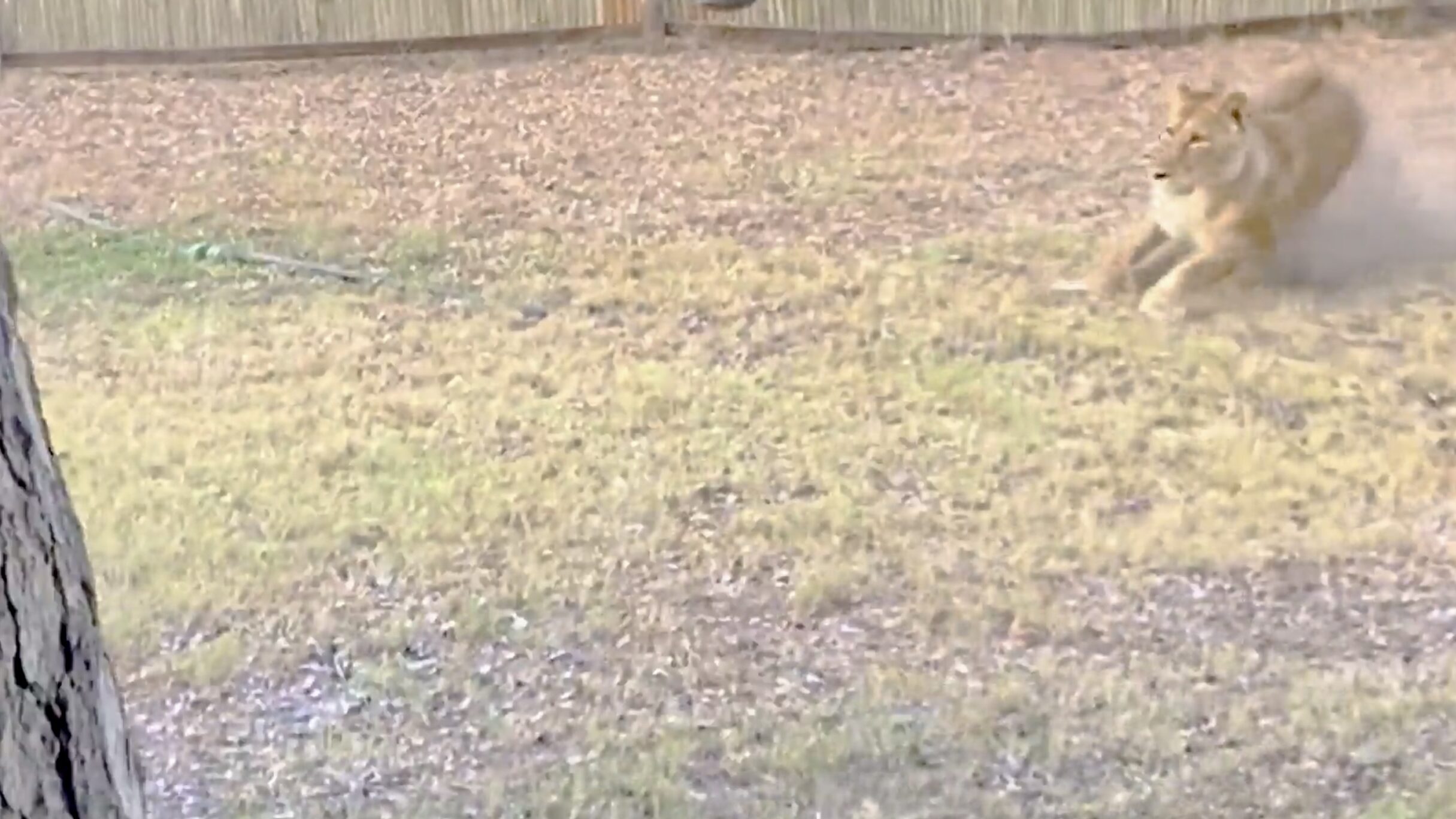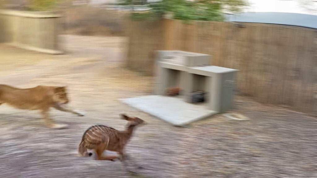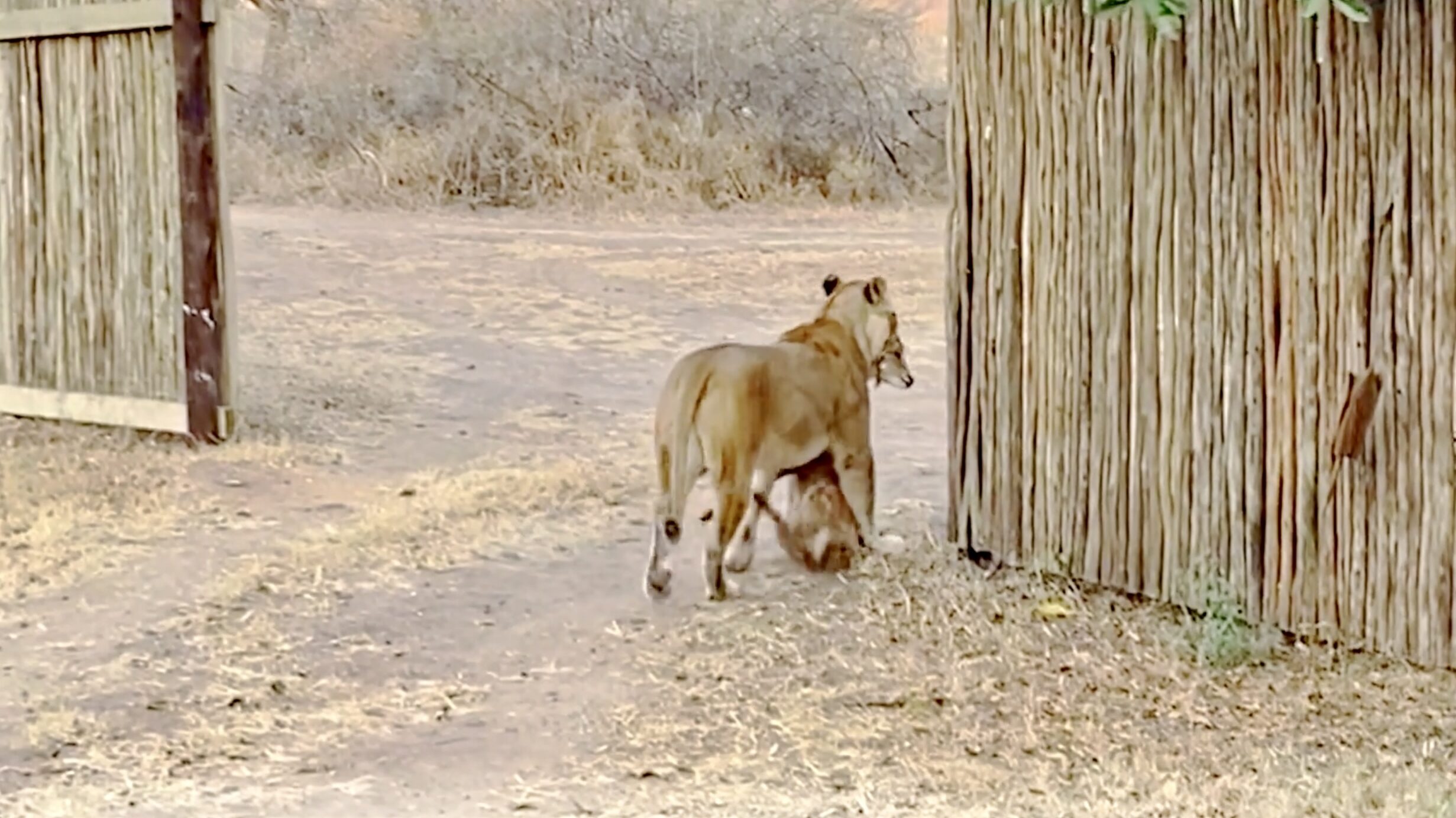 Lions are ambush predators that rely on short bursts of speed and precise timing to catch agile herbivores. This lion waited patiently and assessed its surroundings before striking, exploiting both the buck’s panic and the spatial restrictions imposed by the fencing.