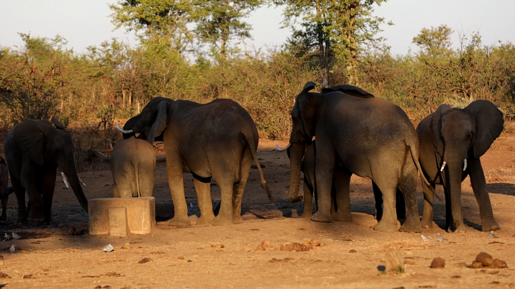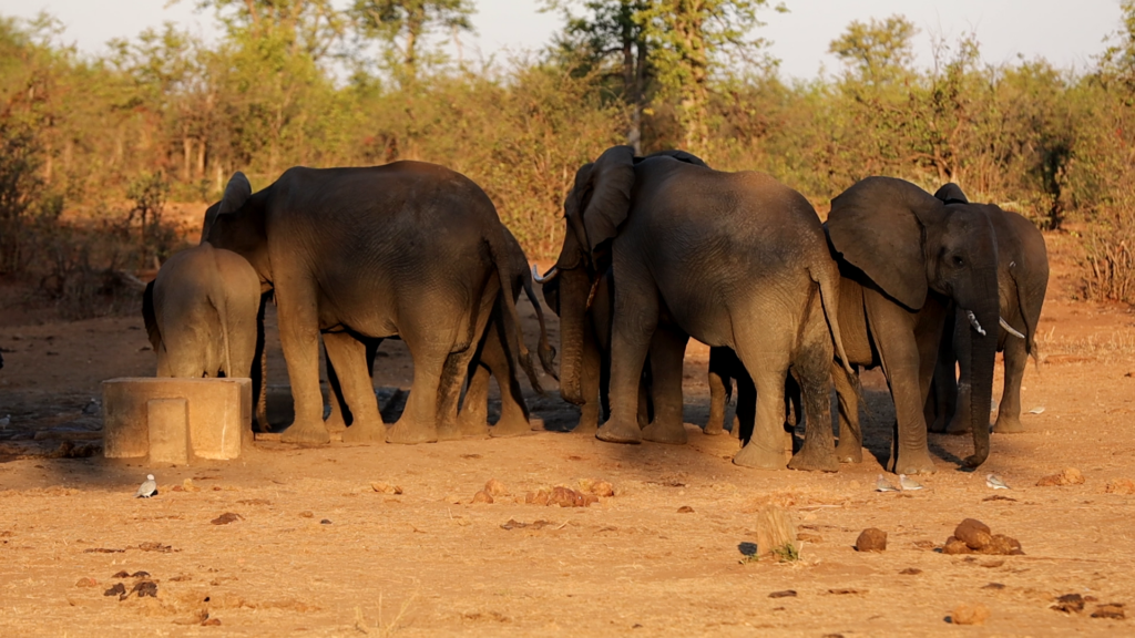 Nardus parked beside a water trough, watching a herd of elephants drink in the warm morning light. The scene of the morning ritual was peaceful as young and old took turns drawing water.