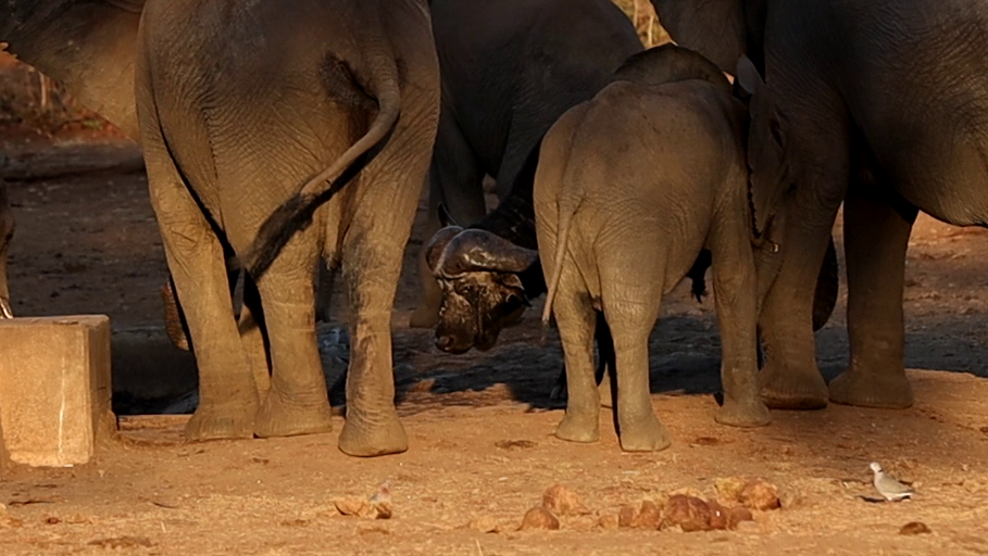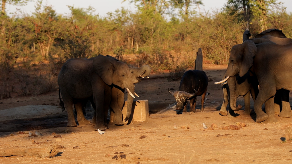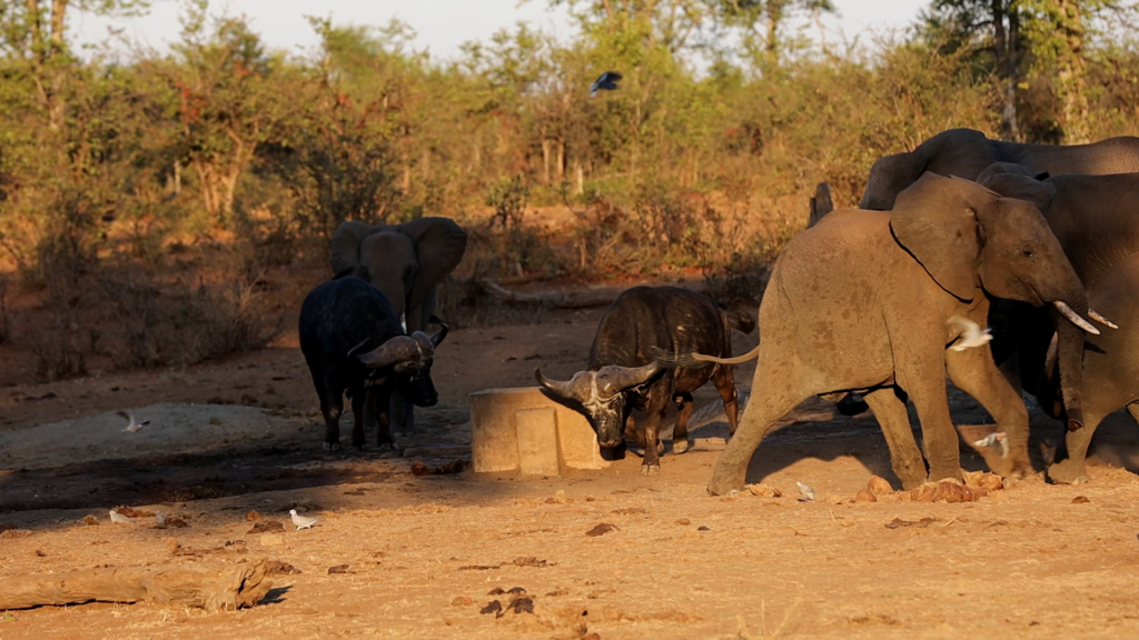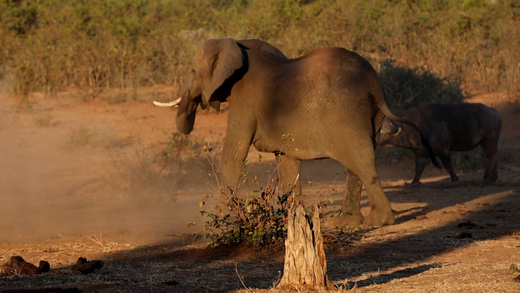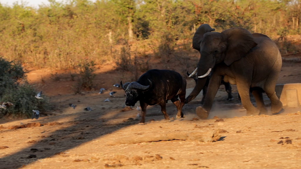 Meanwhile, the old bull moved forward, ponderously lowering his head as he prepared to quench his thirst. Generally, elephants and buffalo will drink twice a day, as both are highly dependent on the life-sustaining resource.