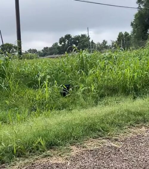 After a few minutes of searching, she noticed something moving in the bushes near a long driveway. As she moved closer, her heart sank when she realized it was the same dog, trembling and whimpering in fear.