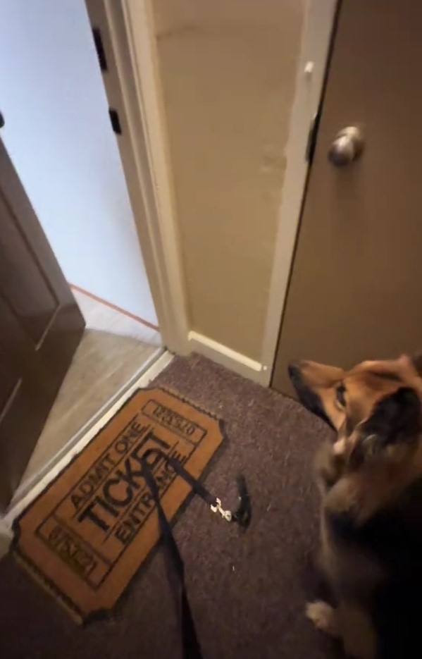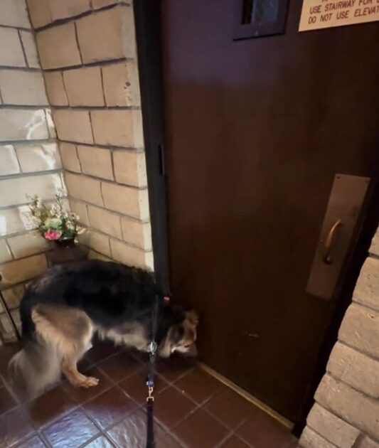 Inside, Max’s excitement grew. He barked, spun in circles, and sniffed with purpose. When the doors opened again, he bolted down the hallway and stopped at a specific apartment door, pawing at it urgently.