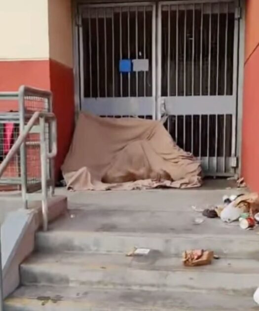 As a traveler prepared to board a train at a California metro station, something unusual on the steps caught their attention. A tarp lay spread out, with a small, unmoving figure resting on top of it.