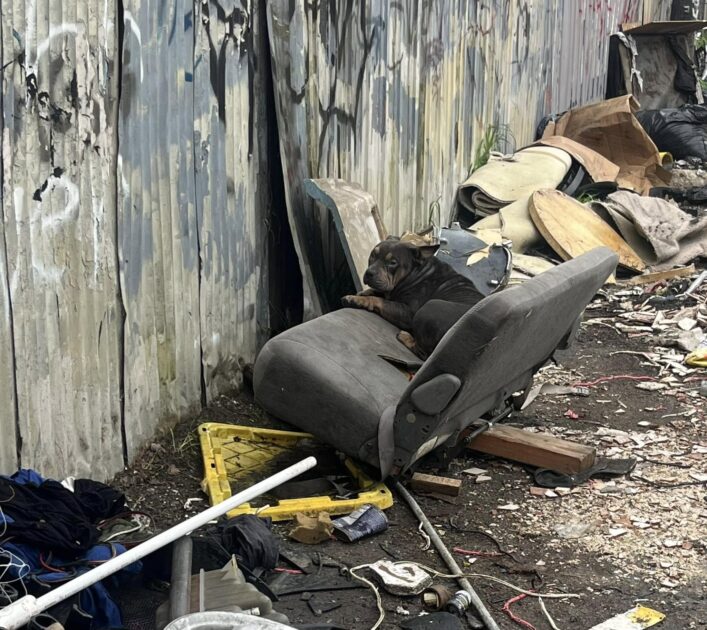 There, tucked away in a filthy corner, was Delta. She was trembling, her cries filled with fear, terrified of everyone and everything around her. Her shelter was nothing more than a pile of discarded trash and the worn frame of an old car bench seat.