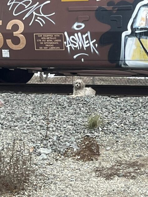The young female pup was sitting alone next to the tracks, crying desperately, as though she was trying to get someone’s attention. She looked distressed, but she refused to leave her spot.