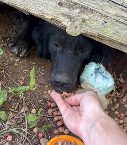 A kind woman named Crystal had already stepped in to help, placing a small crate nearby to give the dog some shelter, especially important since it had been raining often.