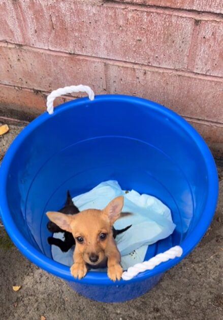 The moment she saw the bucket moving, Mary knew she needed to give it a better look. Then she saw it: two helpless, tiny puppies moving inside. They were practically begging for help with their sad eyes and wagging tails.