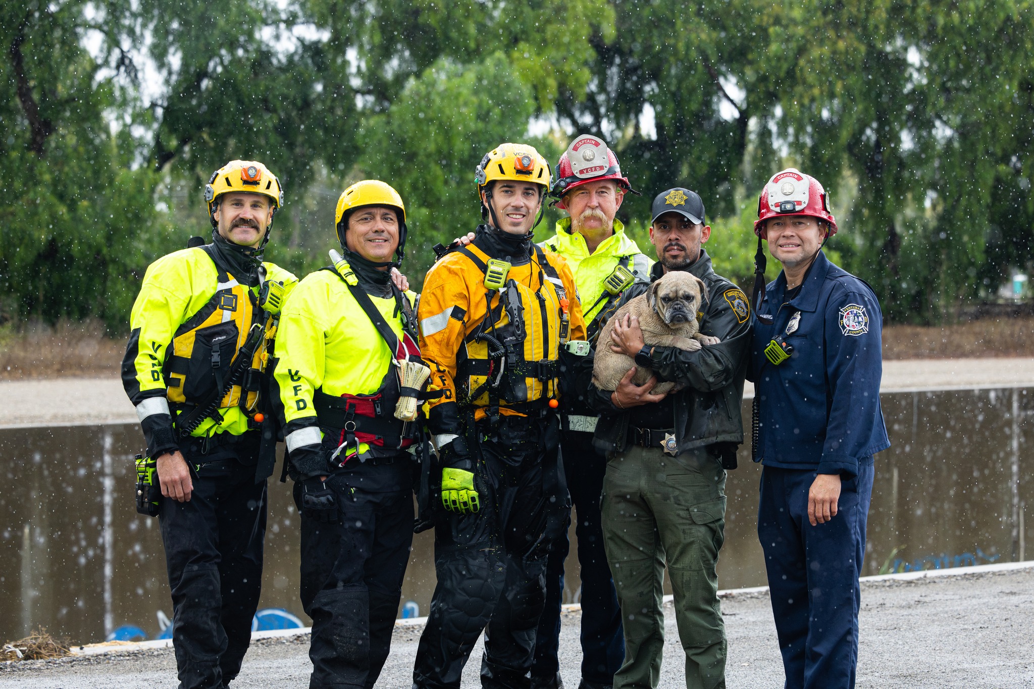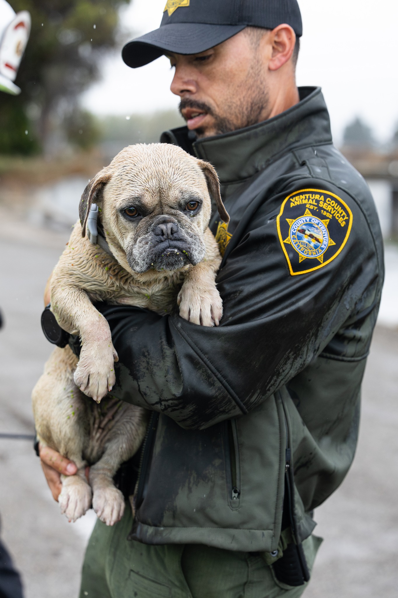 “This morning, VCAS responded to report from Ventura County Public Works Agency of a small dog trapped in the rising waters of the wash at Wood Rd. and Laguna Rd. in Camarillo,” VC Animal Services shared on Facebook.