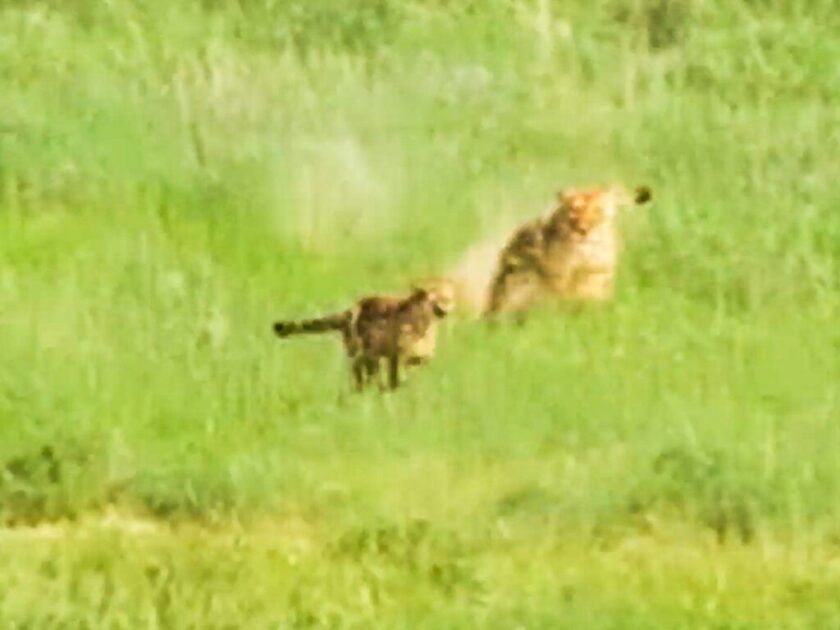 The cheetah might have taken its time turning to run, but once it began the difference in speed between these two animals immediately became clear. The cheetah had been able to afford the time, as now it was leaving the lion behind in the dust.
