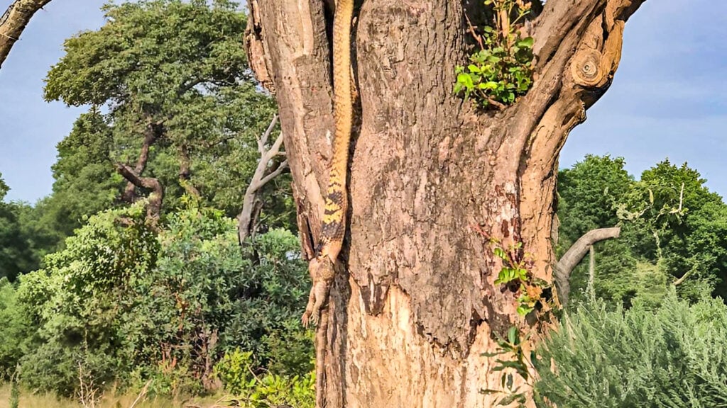 Meanwhile, hanging from its jaws, we see that it has caught a large lizard. The snake in question is a snouted cobra, while the lizard is a rock monitor.