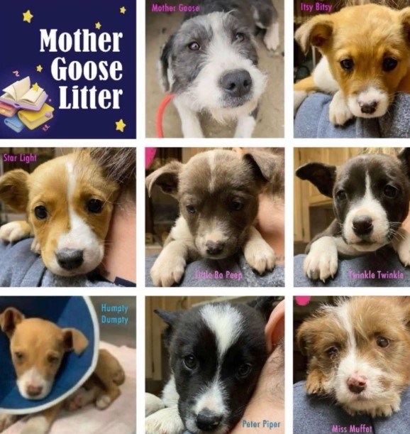 The puppies were given nursery-rhyme-inspired names: Itsy Bitsy, Star Light, Little Bo Peep, Twinkle Twinkle, Humpty Dumpty, Peter Piper, and Miss Muffet.