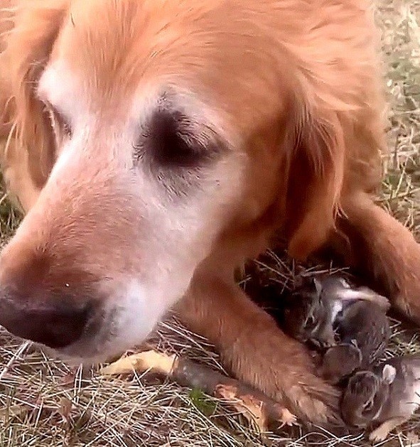 Instead of nudging them around or walking off, Otis carefully tucked the babies between his front paws and licked them softly.