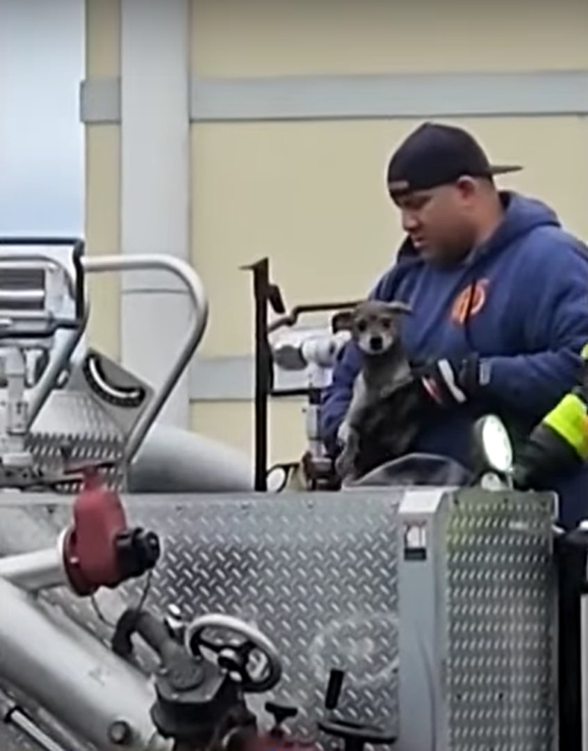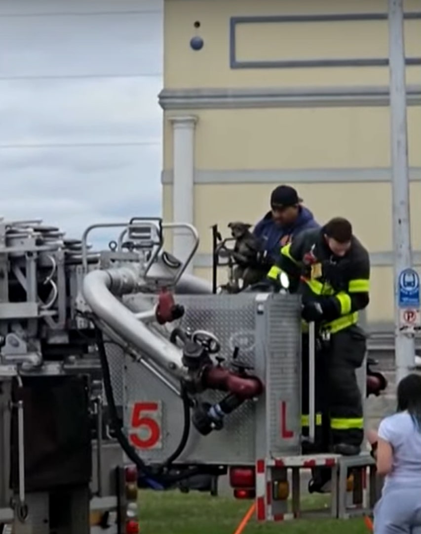 Firefighters were on the scene within minutes, but the rescue itself posed challenges. After surveying the situation, they brought in a ladder truck, lifting one firefighter in a bucket to get close enough to the dog.