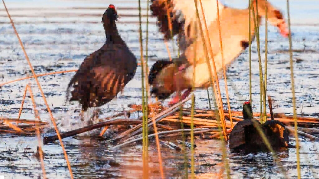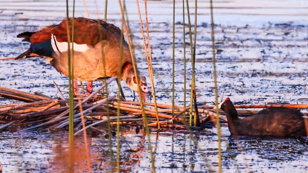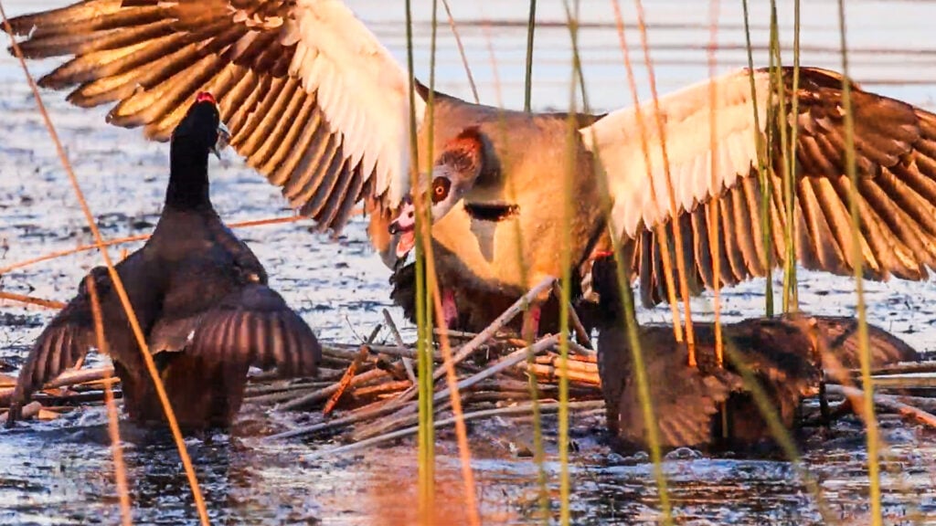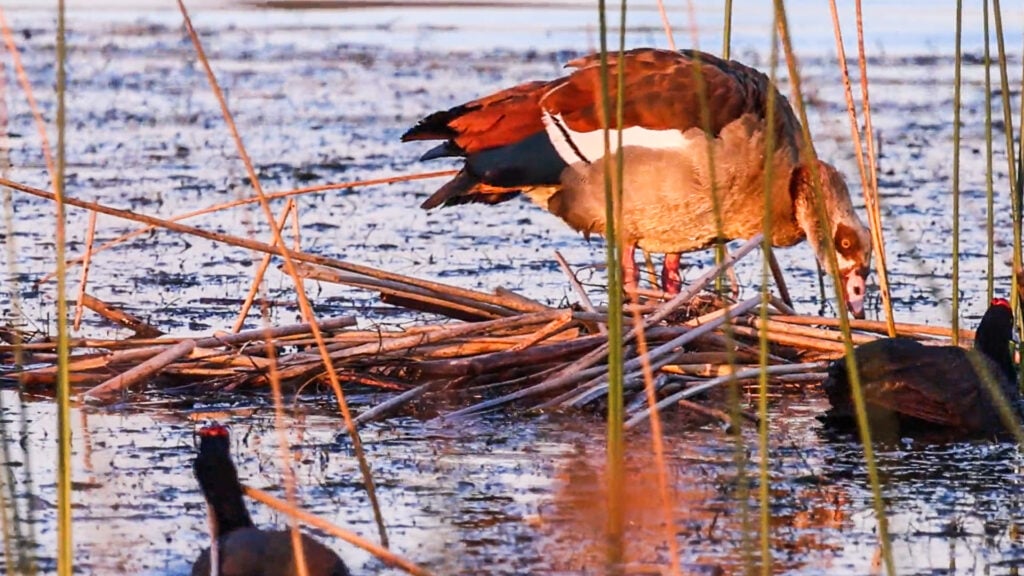 Much smaller than geese, redknobbed coots are also aquatic birds, known to forage among the reeds. In other words, exactly where the goose had decided to set up camp for the night.