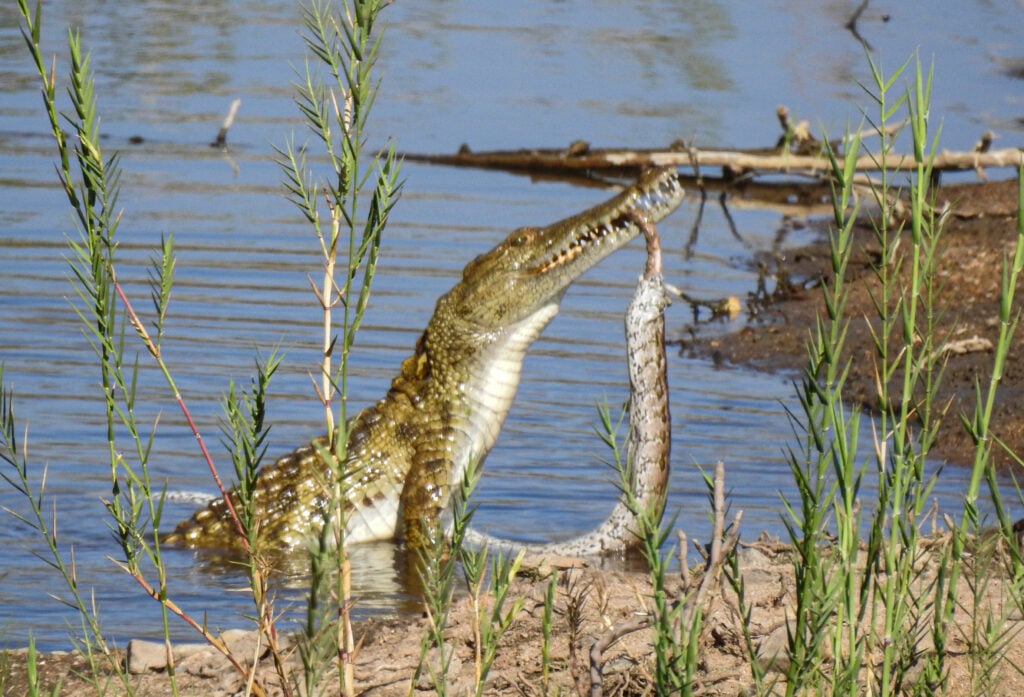 Gayle followed the commotion and discovered a small Nile crocodile had caught an African rock python.
