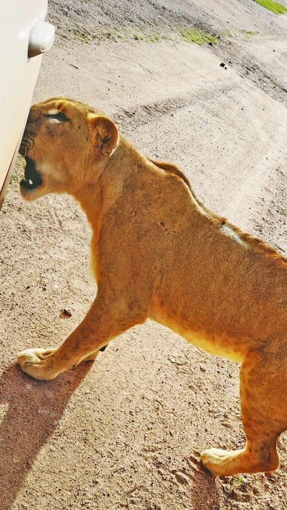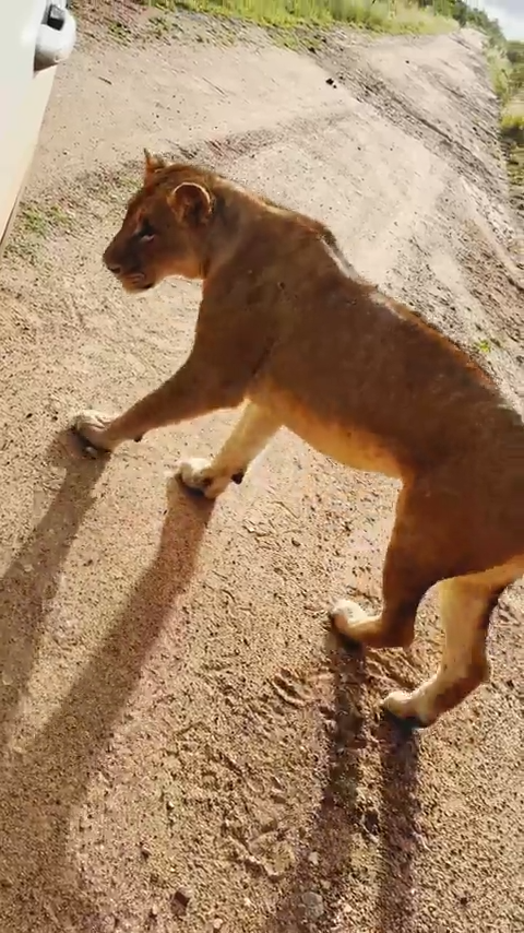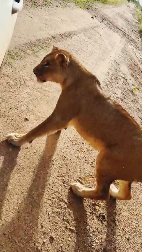 Deon Kelbrick, the owner of the car, managed to capture the moment with his cellphone’s video, saying that the lioness eventually succeeded in puncturing the tyre!