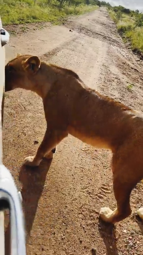 This stationary vehicle was a sitting duck for a curious lioness such as this one.