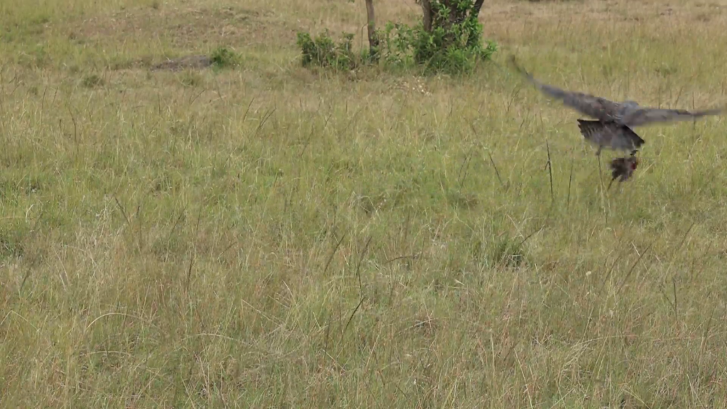 The guinea fowl didn’t look particularly big when compared to the bird of prey, but it might have been a particularly dense bird, or maybe the eagle just pushed off poorly the first time.