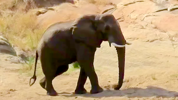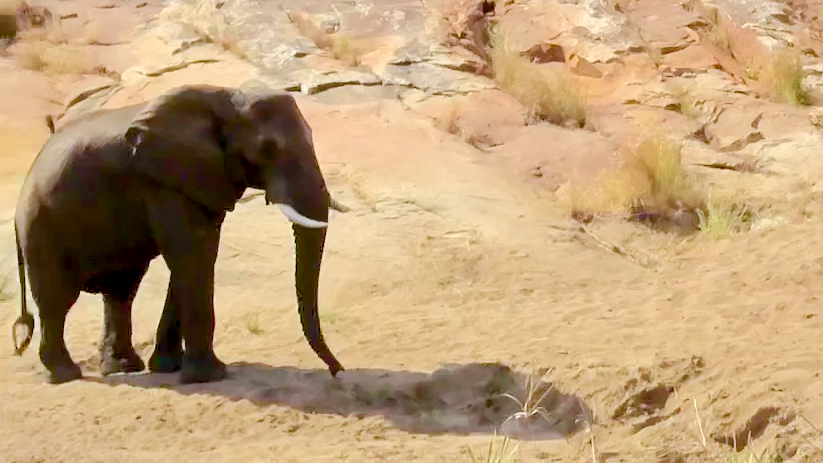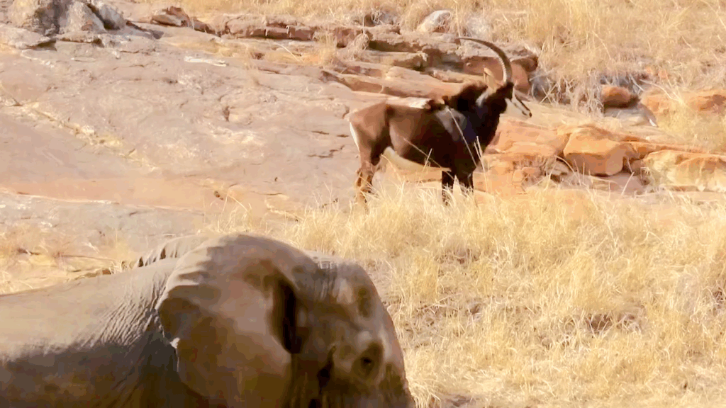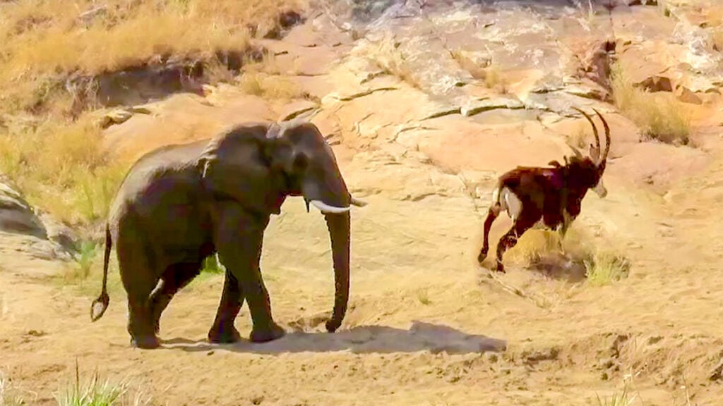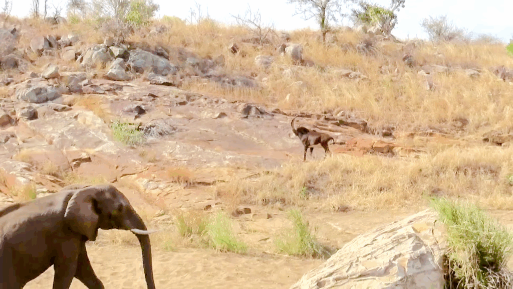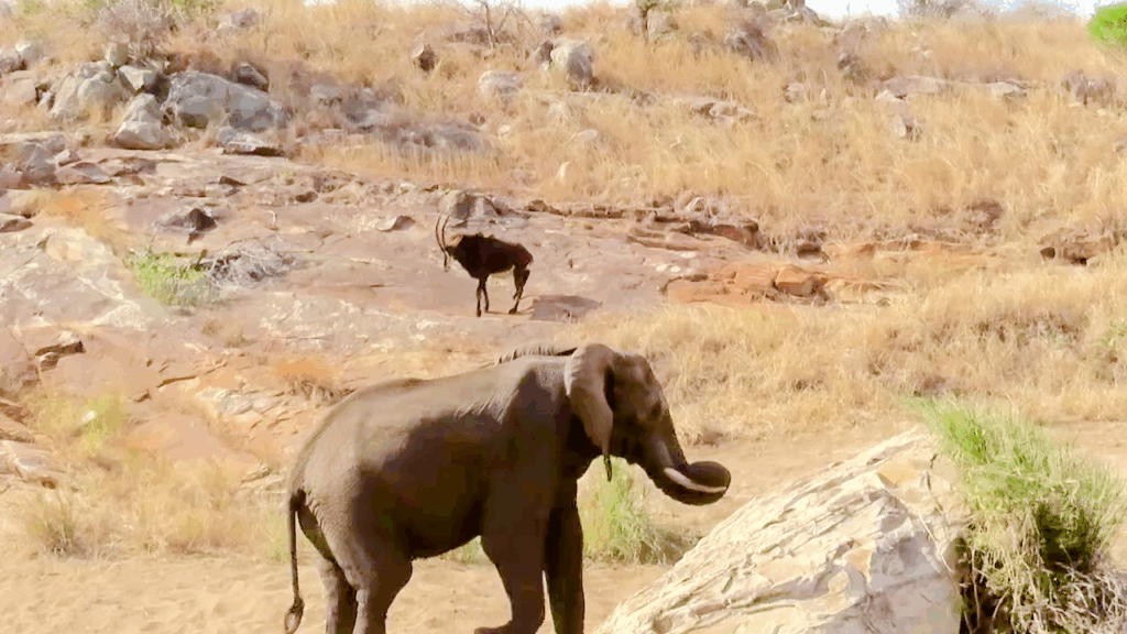As Excellent’s camera pans to the left, our culprit is revealed. A large male elephant is making his way up the riverbed to where the sable once stood.