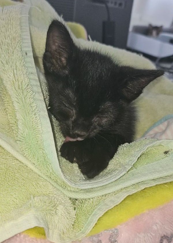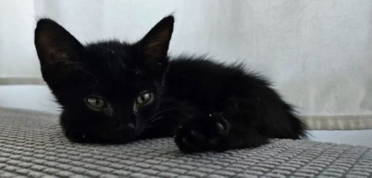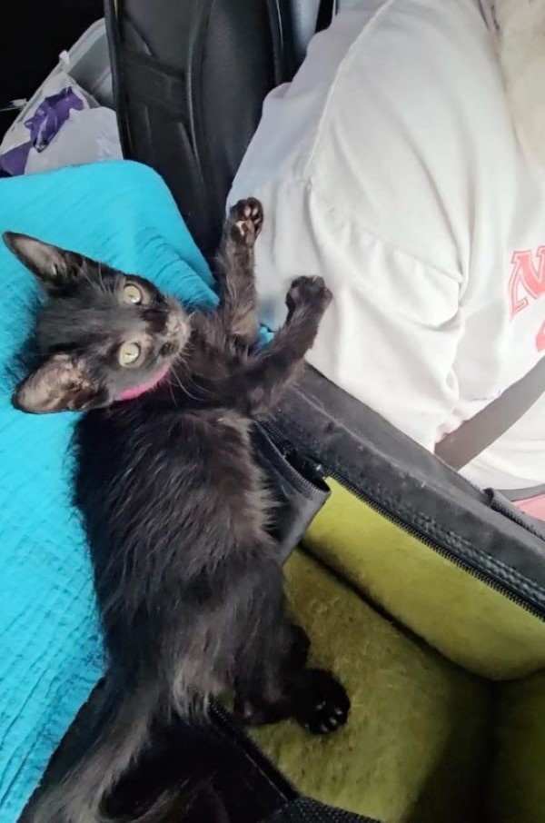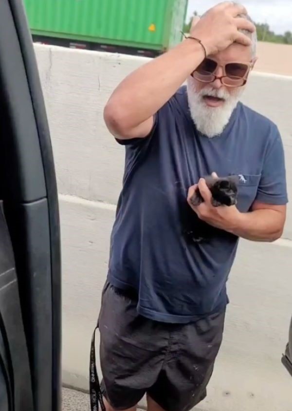 Within seconds, he returned to the vehicle out of breath and holding a small black kitten against his chest.