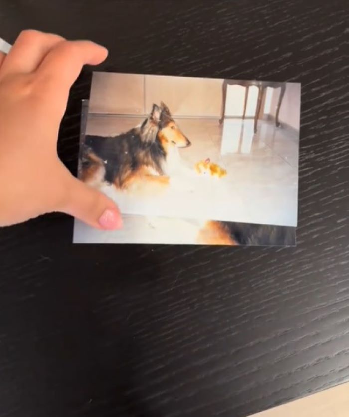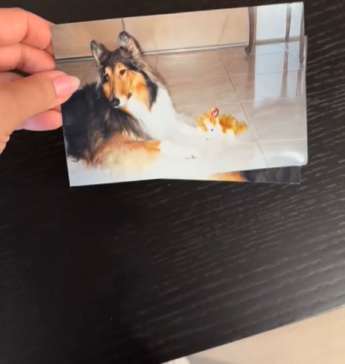 While organizing belongings inside the house, Krystal discovered a collection of photographs. To her surprise, they were images of Honey, the dog whose name appeared on the stone outside.