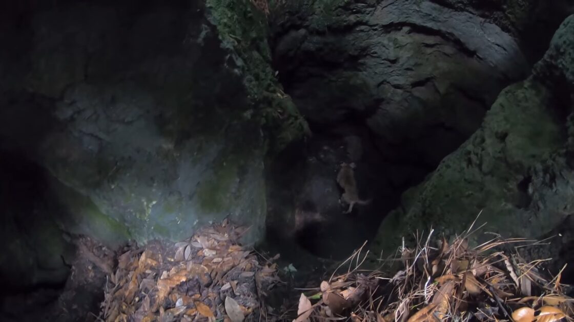Dunn didn’t have proper rescue gear, so he acted quickly with what he had. He dragged a fallen tree stump to the cave’s edge and lowered it inside, hoping the dog could climb out. But the steep walls made that impossible.