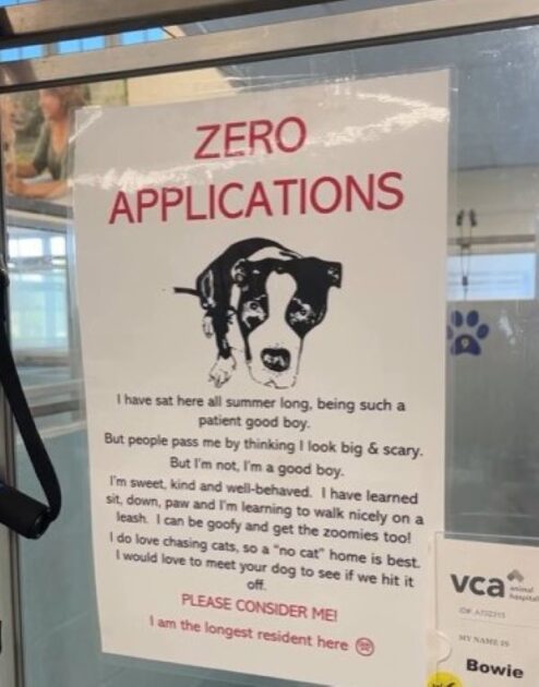 To draw attention to him, staff placed a sign on his kennel that read, “ZERO APPLICATIONS.” They hoped it would make people stop and give Bowie a chance.