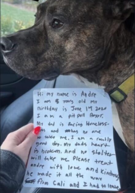 “ ‘Hi my name is Andre. My dad is facing homelessness. I am a really good dog. My dad’s heart is broken. And no shelter will take me.’ These are the heartbreaking words that Andre’s dad tied to his beloved dog,” Tara wrote in a heartbreaking Facebook post.