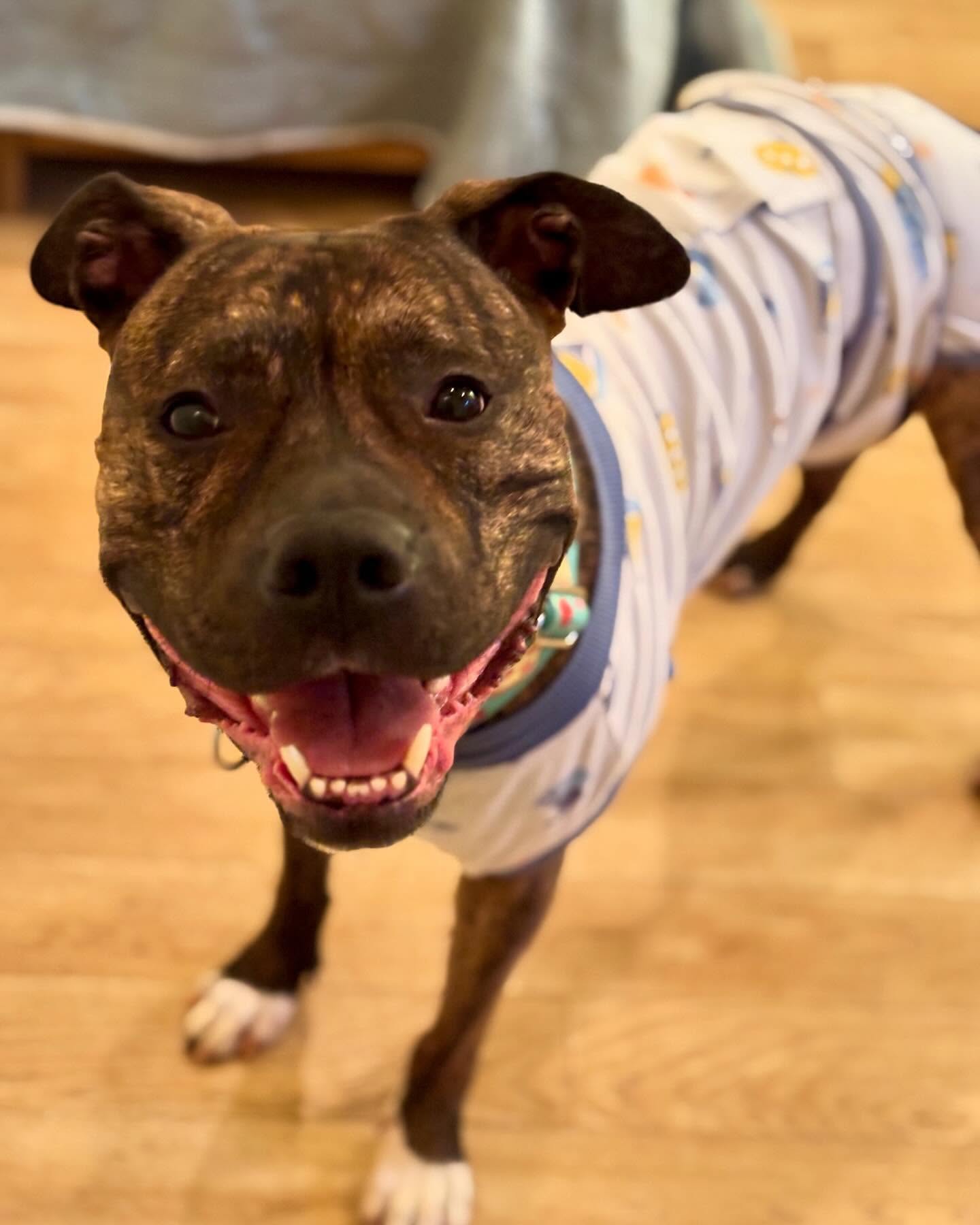 This gentle five year old Pittie mix was left in a Georgia park right before a storm, and the message attached to him made it clear that someone was hurting too.