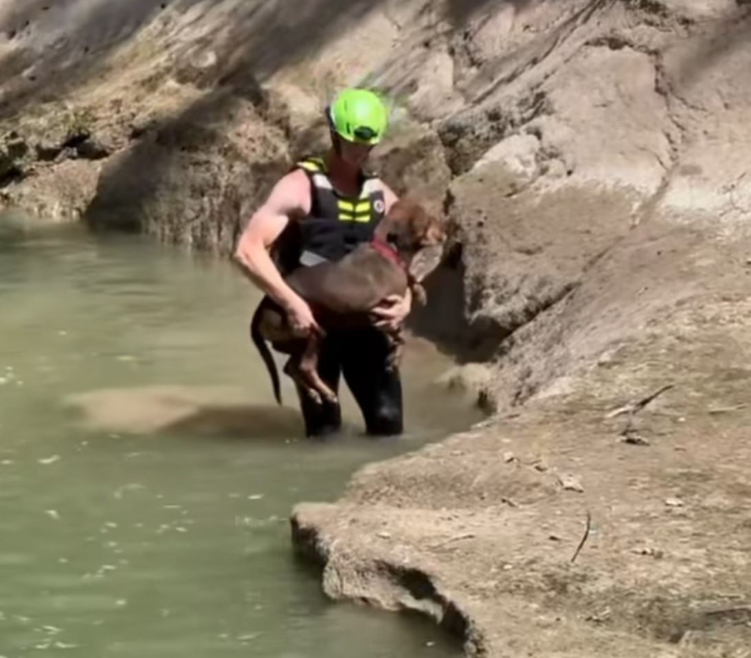 His patience paid off. The firefighter was soon able to lift the dog into his arms and carry him safely back to shore.