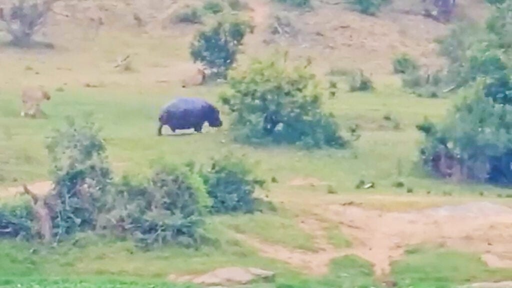 As the massive creature started moving toward them, the lions finally seemed to understand the severity of the situation. They bolted for the bushes, not daring to challenge the hippo again.